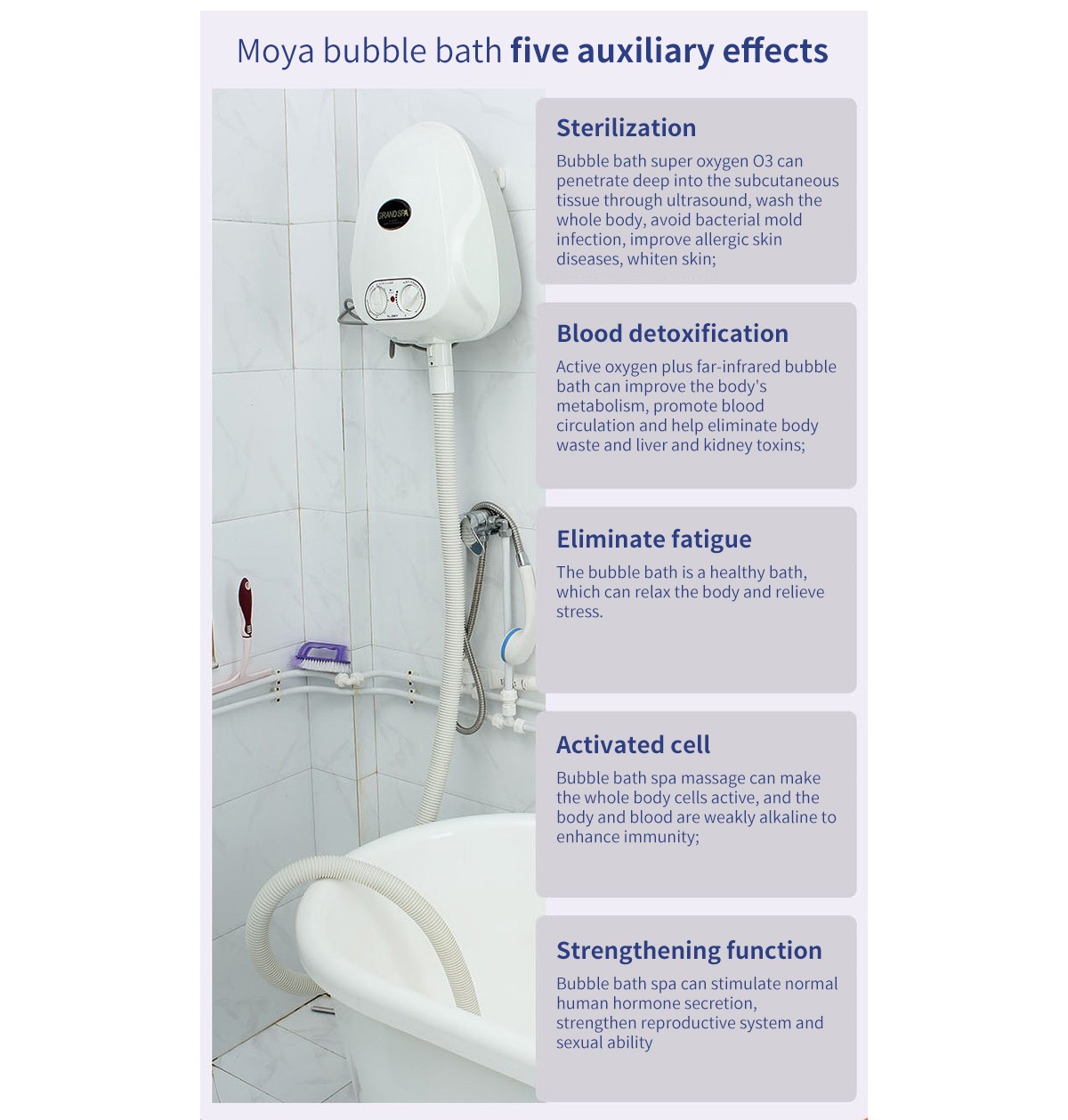 | آنیون های O₃ | حباب هوای 1,000,000 O₃ در هر ثانیه که کیفیت آب حمام و هوای اطراف حمام را بهبود می بخشد. | صفر | صفر | صفر |